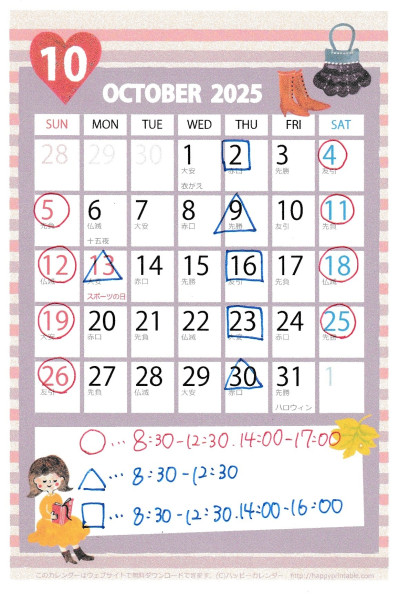 2025年10月の営業日 基本的な営業時間は下記の通りです。 平日:8:30~12:30/15:00~20:00木曜:8:30~12:30/14:00~16:00土日:8:30~12:30/14:00~17:00 祝日:8:30~12:30 10/9(木)、10/13(月)、10/30(木)は午前中のみの営業とさせていただきます。 以上、よろしくお願いいたします。