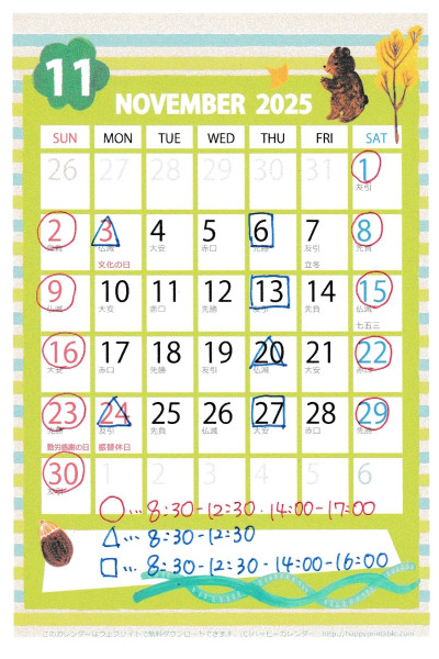 2025年11月の営業日 基本的な営業時間は下記の通りです。 平日:8:30~12:30/14:00~20:00 木曜:8:30~12:30/14:00~16:00 土日:8:30~12:30/14:00~17:00 祝日:8:30~12:30 尚、20日(木)は午前のみの営業です。 以上、よろしくお願いいたします。