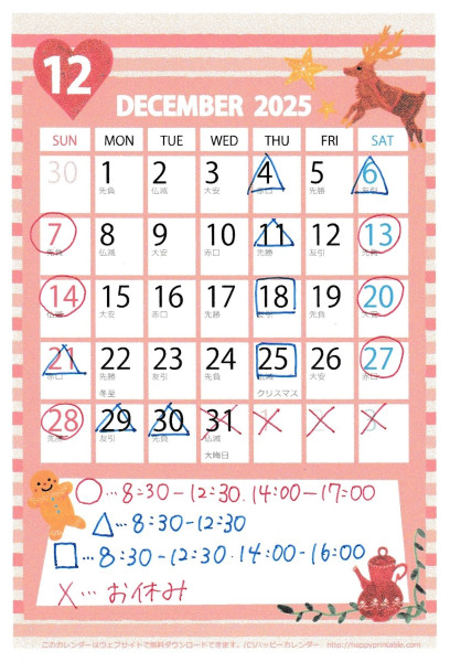 2025年12月の営業日 基本的な営業時間は下記の通りです。 平日:8:30~12:30/15:00~20:00木曜:8:30~12:30/14:00~16:00土日:8:30~12:30/14:00~17:00 祝日:8:30~12:30 12/4(木)、12/11(木)、12/21(日)、12/29(月)、12/30(火)は午前中のみの営業とさせていただきます。 年末年始のお休みは、12/31(水)~1/3(土)です。 来年は、1/4(日)から通常通り営業します。 以上、よろしくお願いいたします。
